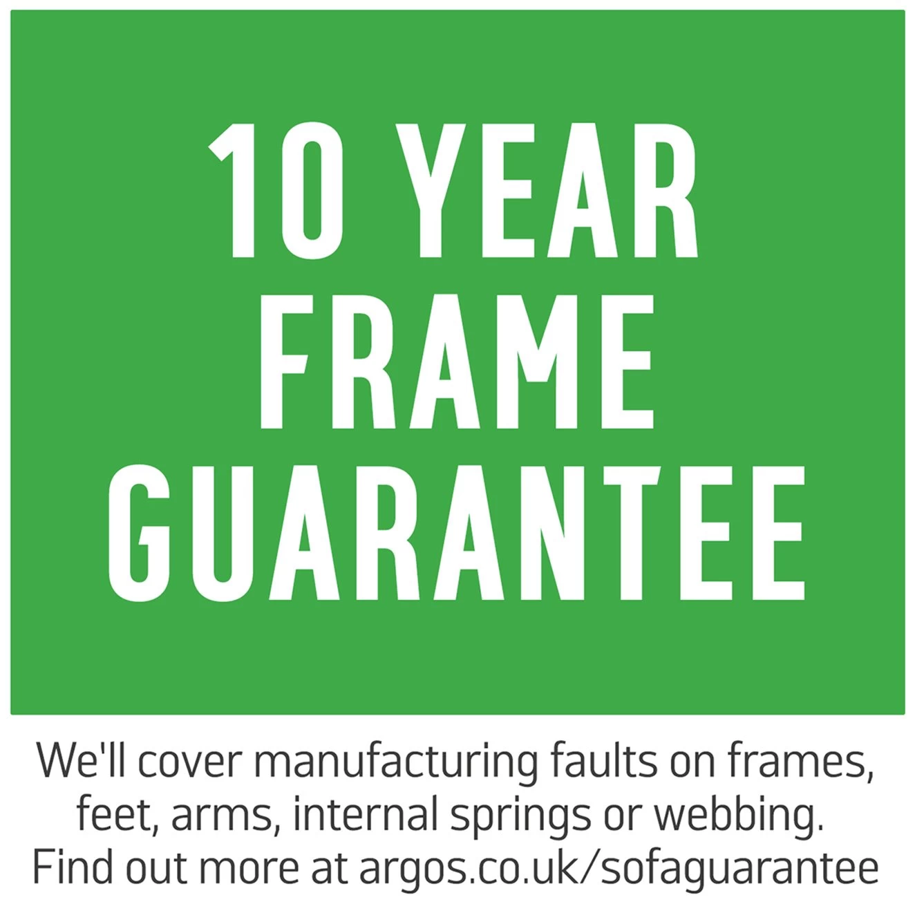 This sofa comes with a 10 year frame guarantee. We'll cover manufacturing faults on frames, feet, arms, internal springs or webbing. We can arrange a repair, replacement, exchange or refund.
