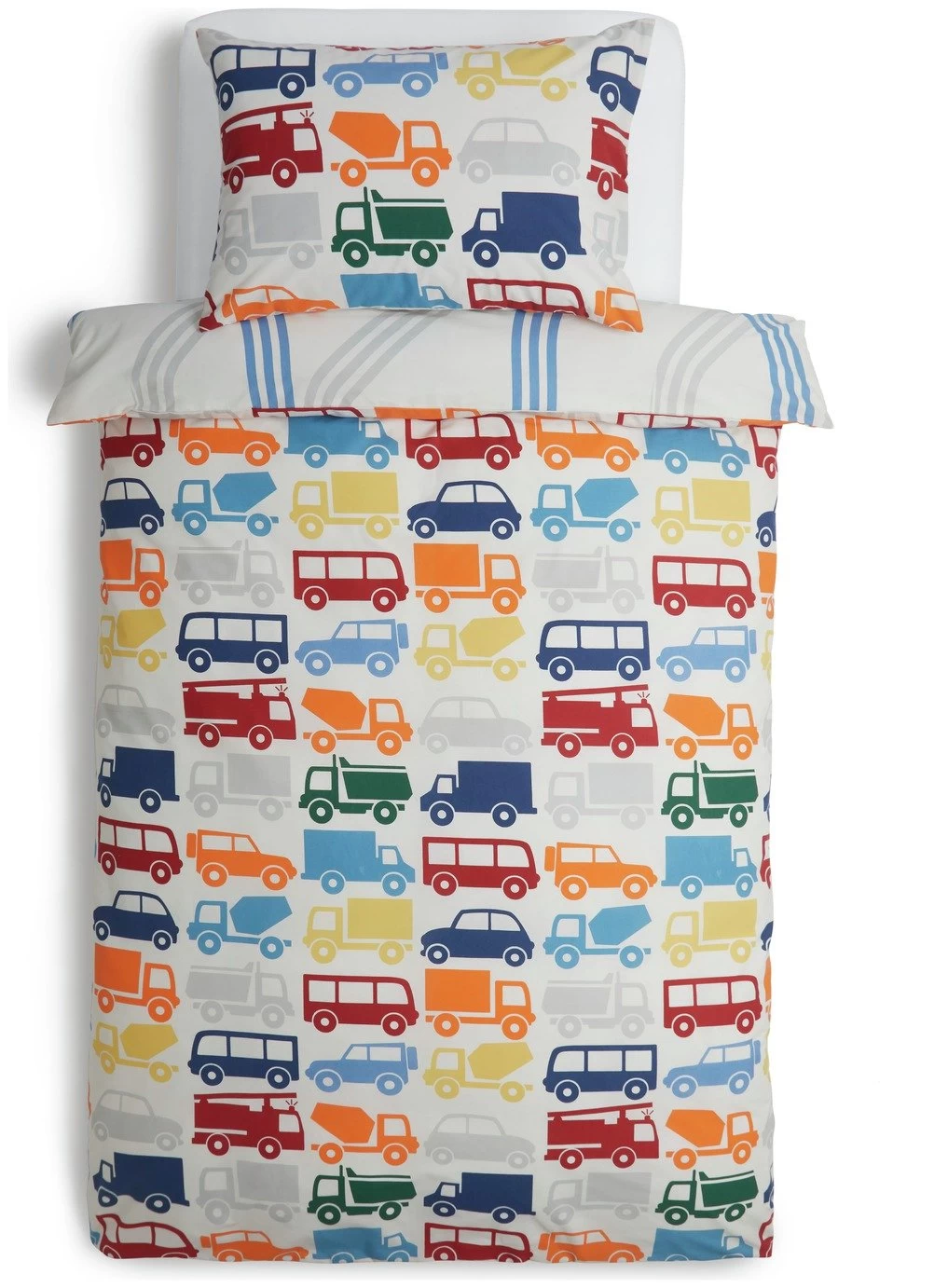 Off to dreamland? Take a bus, lorry or fire engine with our cute duvet set. Covered in a variety of brightly colored vehicles and curvy tyre tracks, this reversible design makes a fun addition to your youngster's bedroom. Woven in polycotton, the cover and pillowcase are as soft as they are durable. Button fastenings mean quick and easy sheet changes too. Vroom vroom!