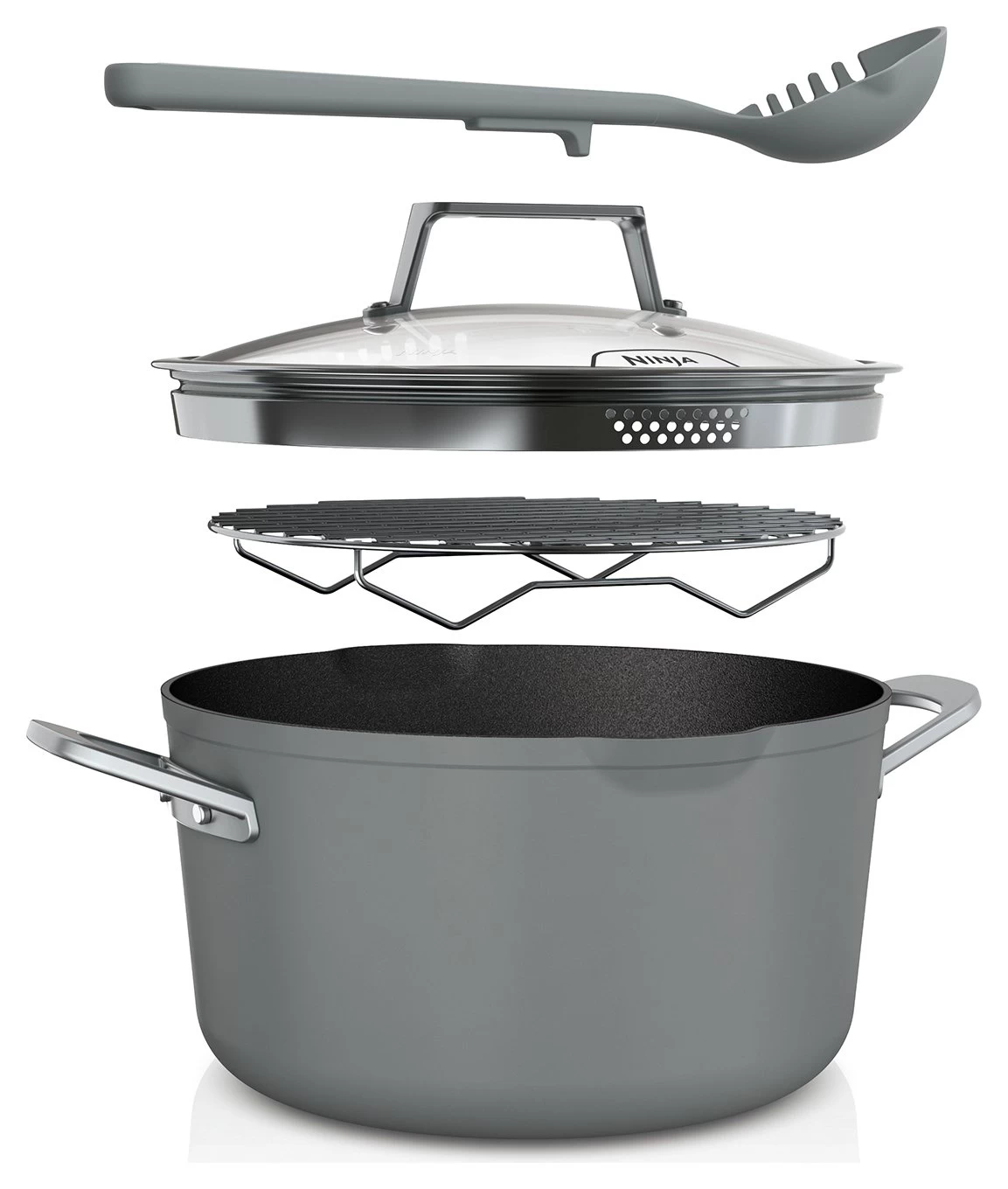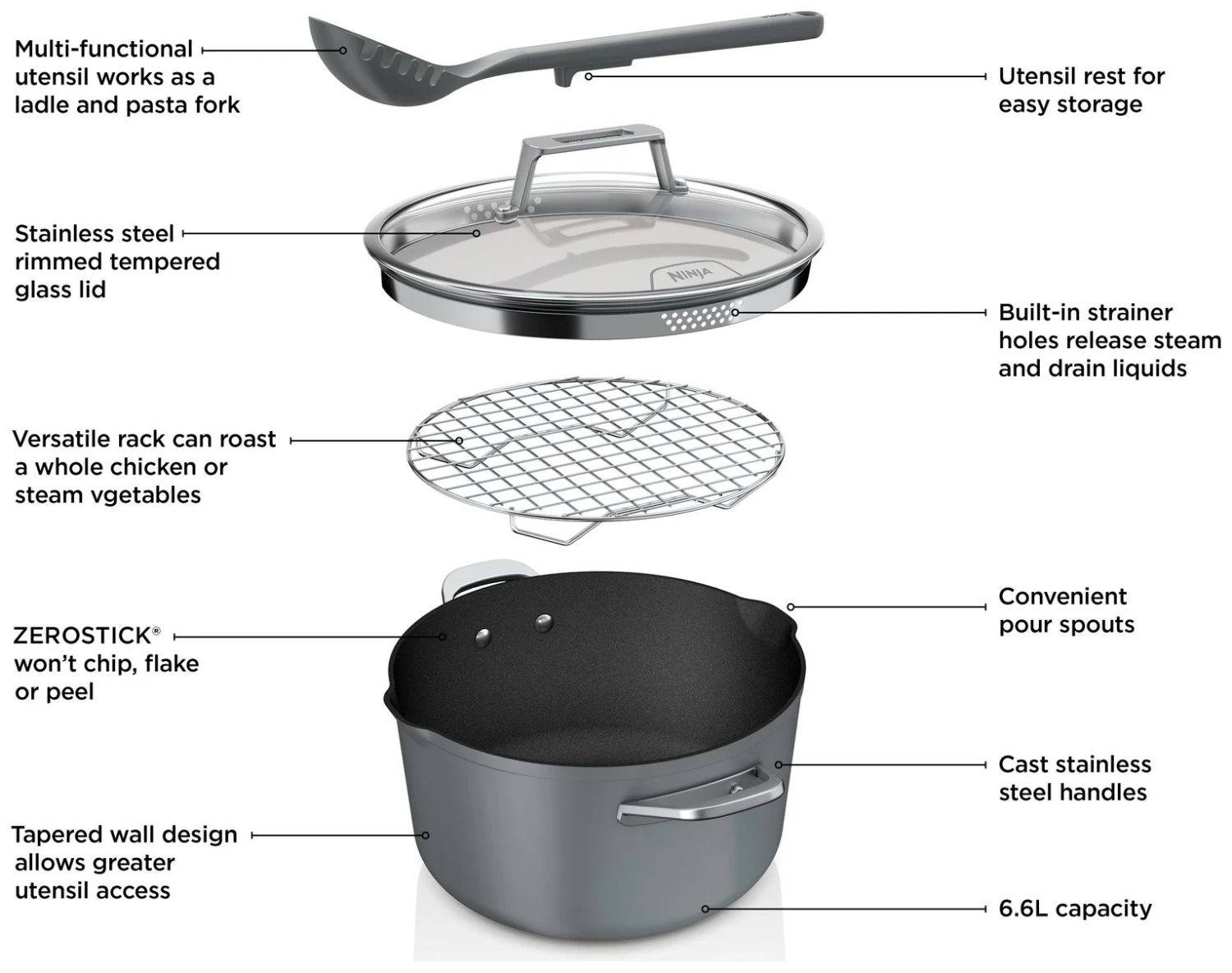 Zero chip, flake or peel – Ninja ZEROSTICK is dishwasher safe, scratch resistant, durable and long-lasting. Crafted from forged aluminium for even cooking and excellent searing, with cast stainless steel handles. Cook using little to no oil. PFOA, lead and cadmium free.