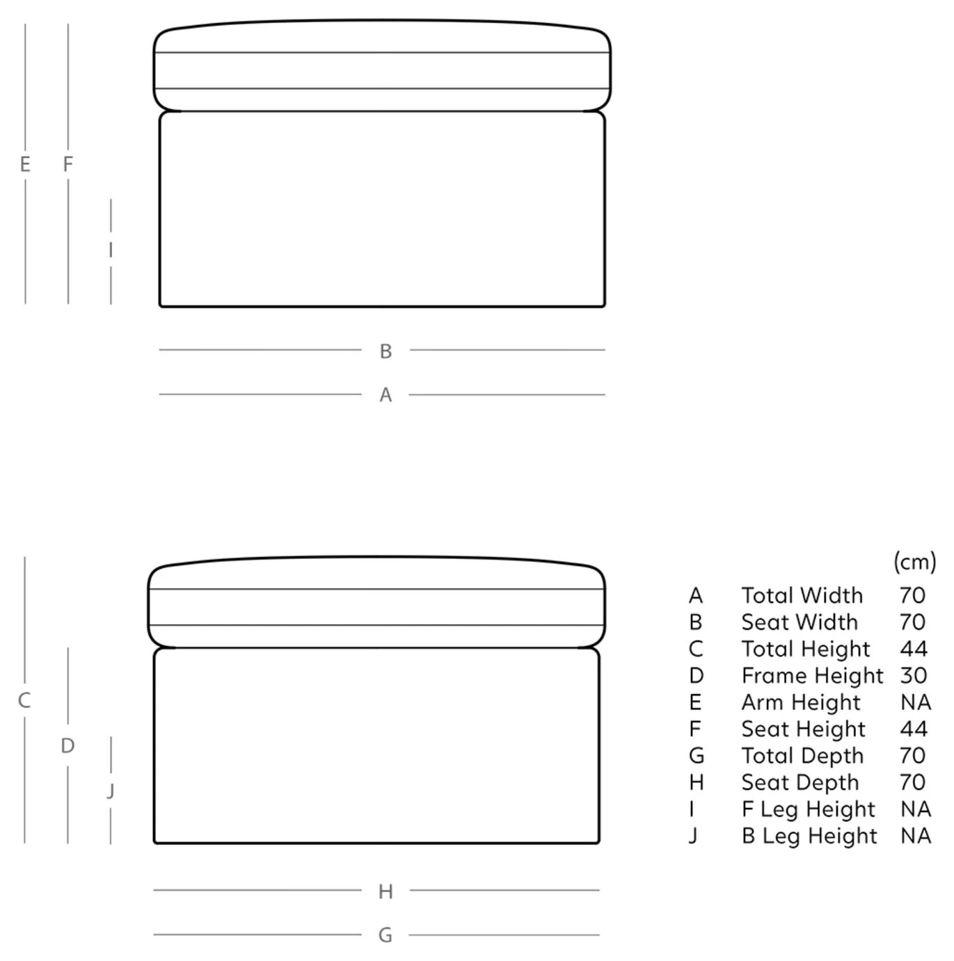- Size H44, W70, D70cm.