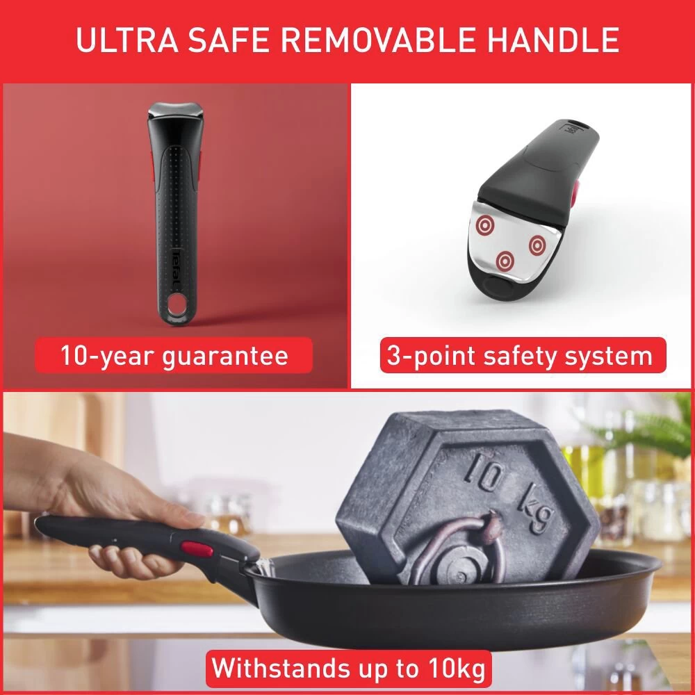 Simplify your cooking with Tefal Ingenio Daily Chef: durable cookware with our iconic removable handle. Ingenio is a total game-changer in the kitchen. Minus the handle, these pans stack inside each other. Plus, it's a bit of a magician in the kitchen, turning frying pans into oven dishes, and saucepans into bakeware. Start cooking on the hob then move the pan into the oven. Unclip the handle and voila: the pan is a baking tin. The pots also make stylish serving dishes; just use the handle to go from oven to table. Talk about versatile!